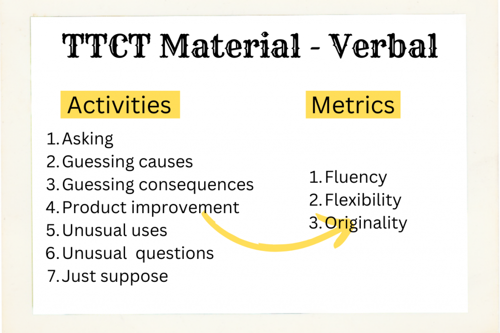 The figure below shows the required outline of activities and scoring for the Torrance Test of Creative Thinking – Verbal. As the name suggests, everything is done verbally and the response is measured.
